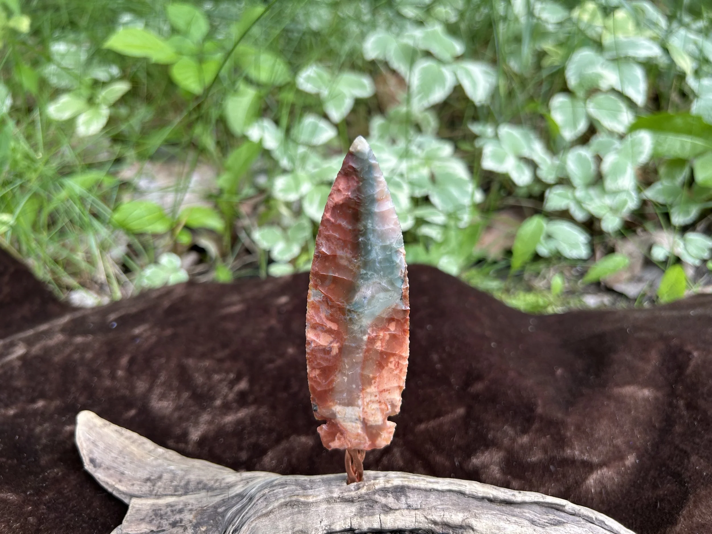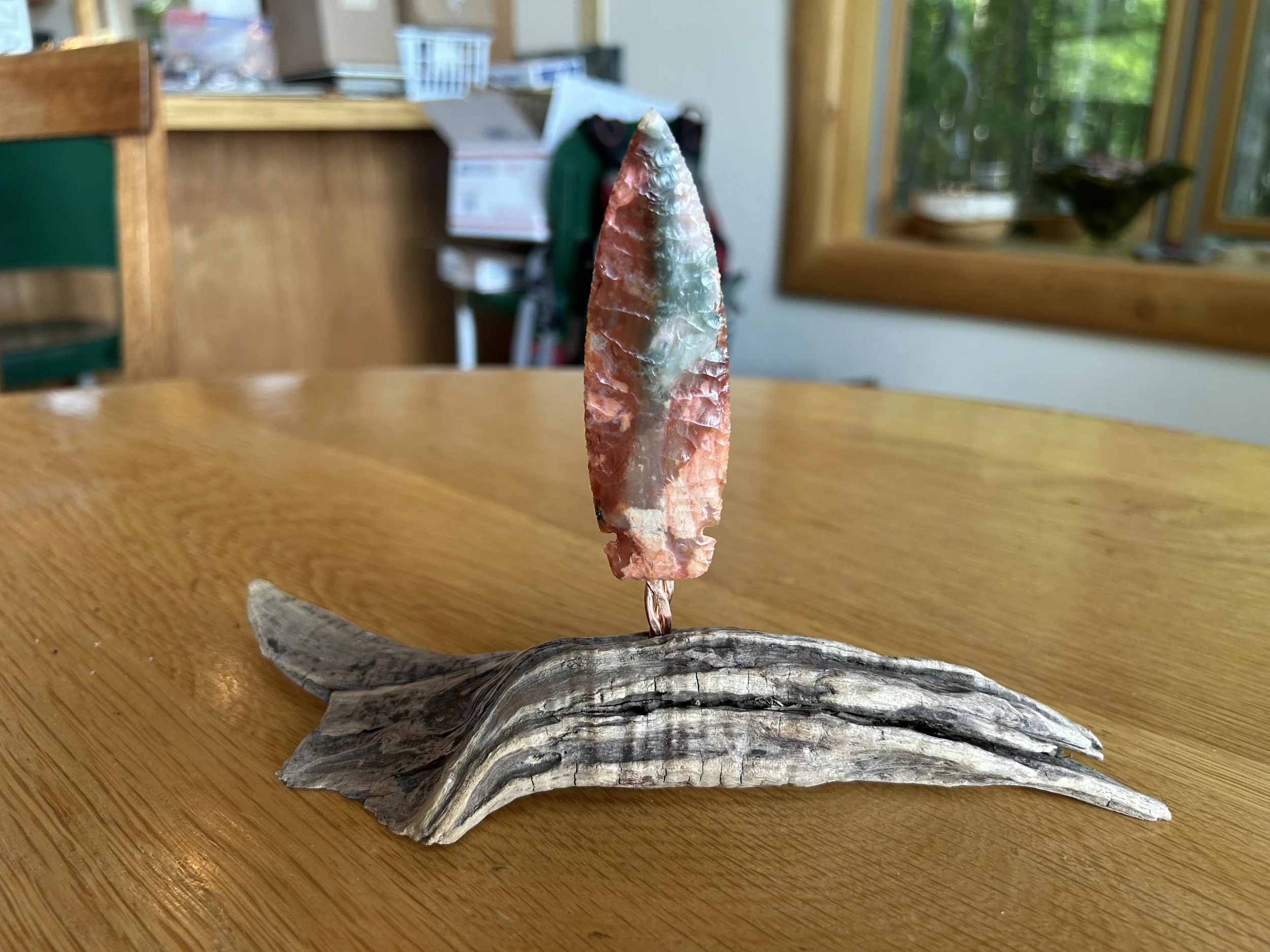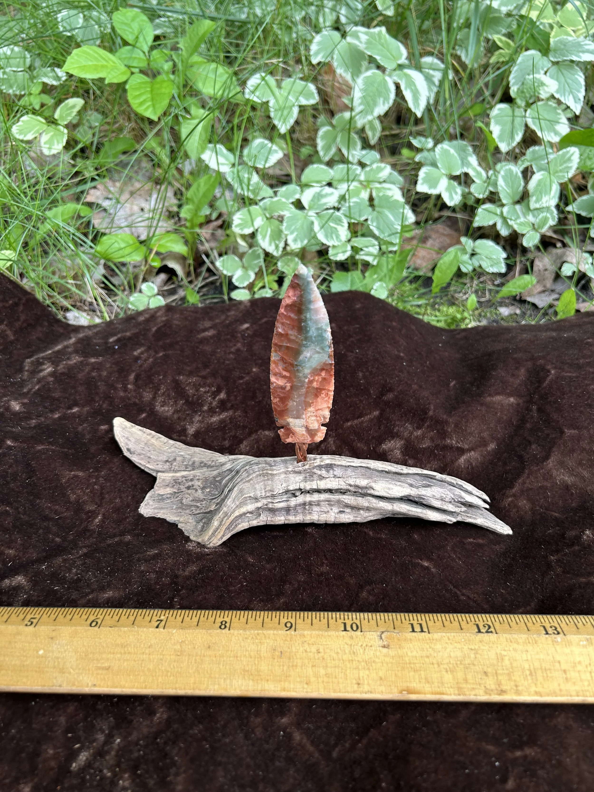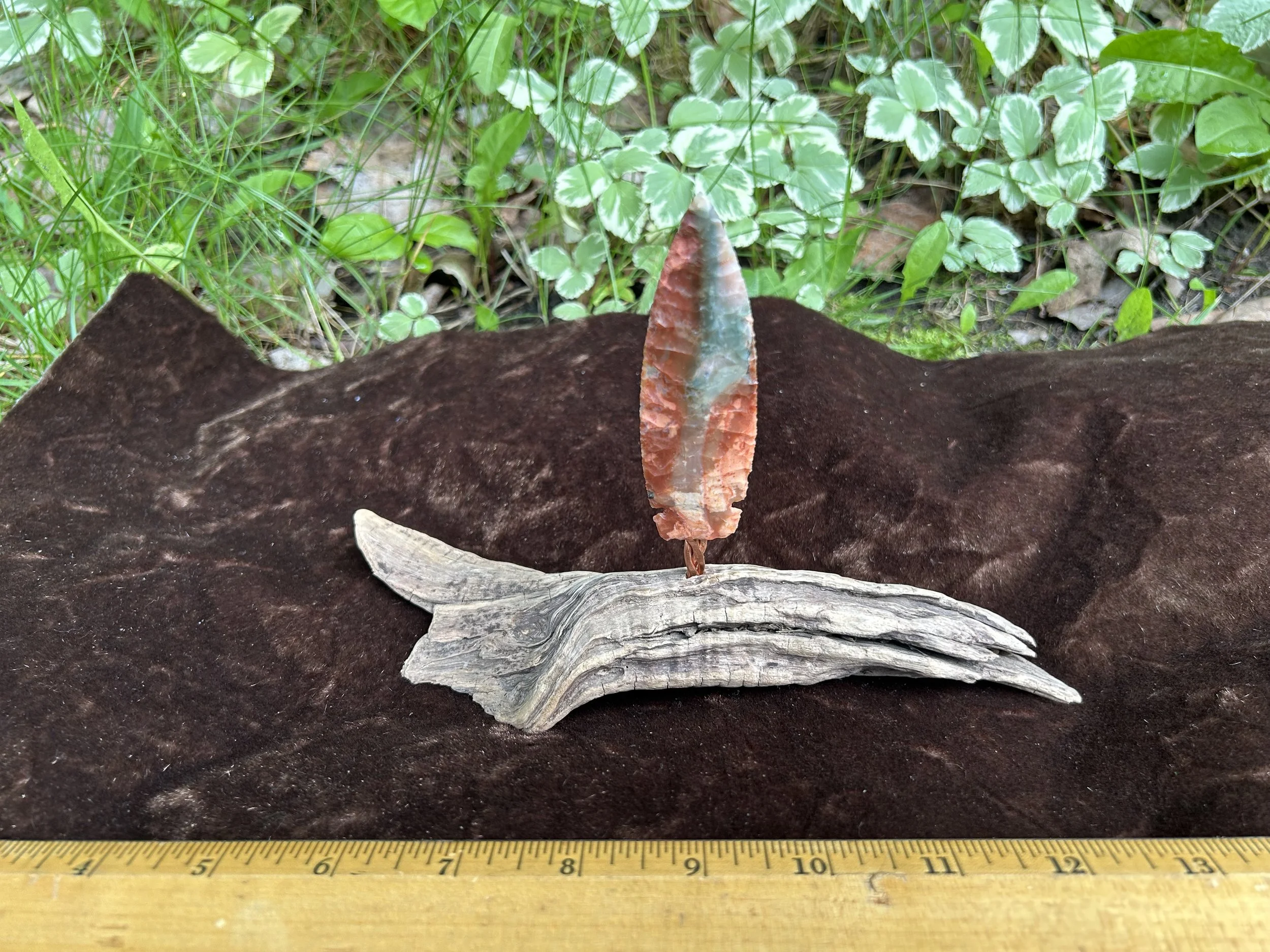 This beautiful piece is made using Tri-Flow Obsidian for the blade, and Alligator jaw for the handle. A piece of bone was created for the base of the knife, and a small section was placed below on the display, creating a unique overall display. As with all of our knives, every piece has been completely hand-crafted by Bill. The overall display measures 18.5-inches long, 8-inches deep, and 11-inches high. The knife measure 13.75-inches long, with the blade measuring 6.75×2-inches.
